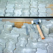 - An den Stellen, an denen die Anker in den Grundelementen vormontiert sind, wird in die Tragschicht eine ca.10 cm tiefe und ca. 5 cm breite Kerbe getrieben. Ein großes Stemmeisen kann dafür gut geeignet sein. Die Grundelemente werden anschließend so gestellt, dass sich die Anker in der Tragschicht befinden. Mit einer Beton-/Zement-Mischung werden die Anker nun einbetoniert.